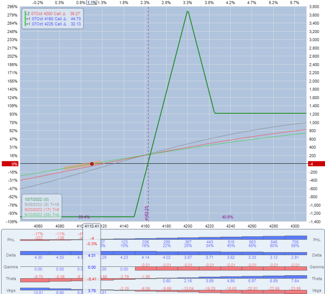 If you have a specific target in mind, let’s say you think SPX will end the week at around 4200, you can do an Out of The Money balanced butterfly with the short strikes at 4200. You can use the wings to control your buying power and delta exposure. The width of the butterfly dictates the the probability of profit, the deltas and the profit zone at expiration. So it’s a give and take game. Here are a few examples of different widths so you can see how the risk profiles vary.